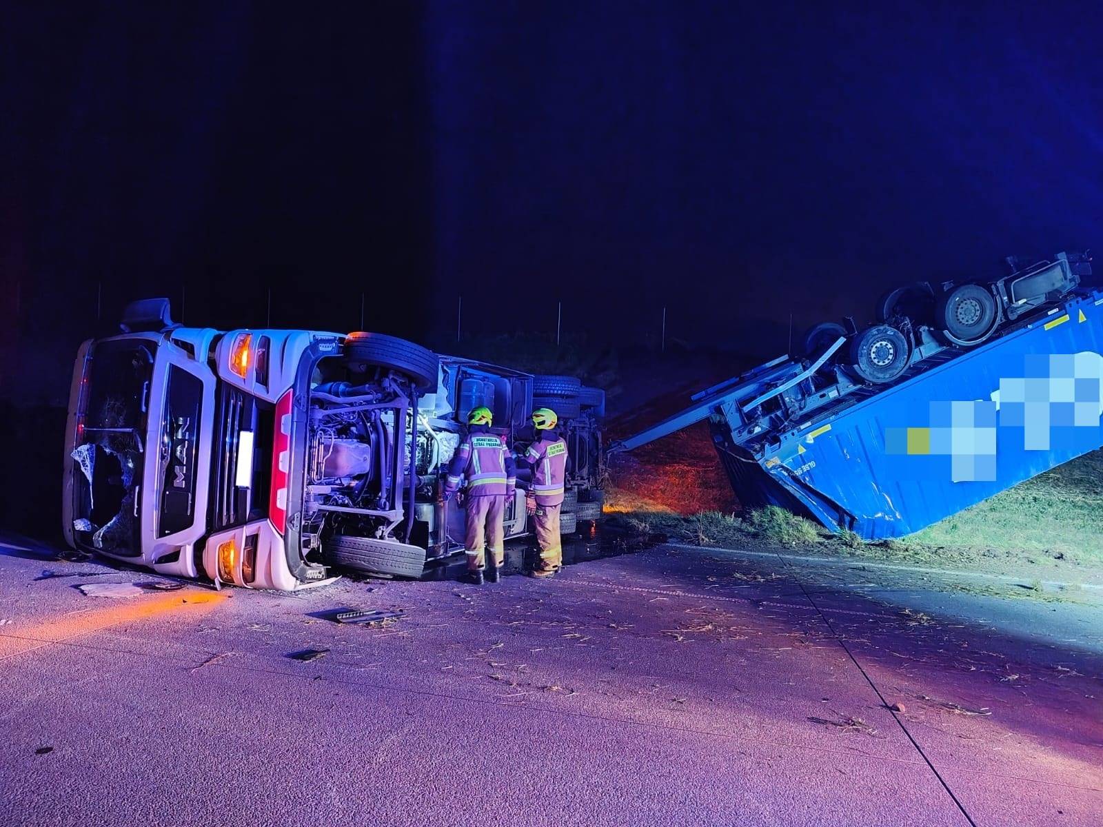 Na miejscu doszło do rozległego wycieku płynów eksploatacyjnych i paliwa - plama substancji rozciągała się na powierzchni około 20 m². Strażacy zabezpieczyli miejsce zdarzenia oraz przystąpili do neutralizacji zagrożenia chemicznego. Ich działania zakończyły sie po godzinie 5.00 rano, ale na miejscu cały czas pracują służby drogowe.