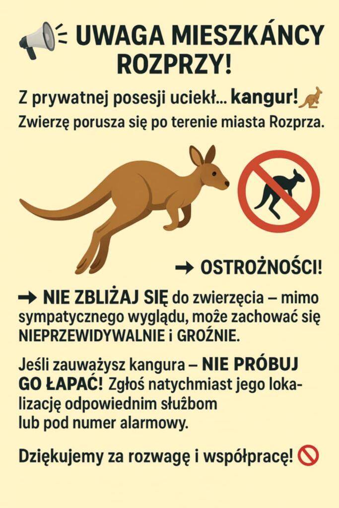 - Jeśli zauważysz kangura – NIE PRÓBUJ GO ŁAPAĆ! Zgłoś natychmiast jego loka-lizację odpowiednim służbom lub pod numer alarmowy - zaapelowali do mieszkańców urzędnicy z Rozprzy.