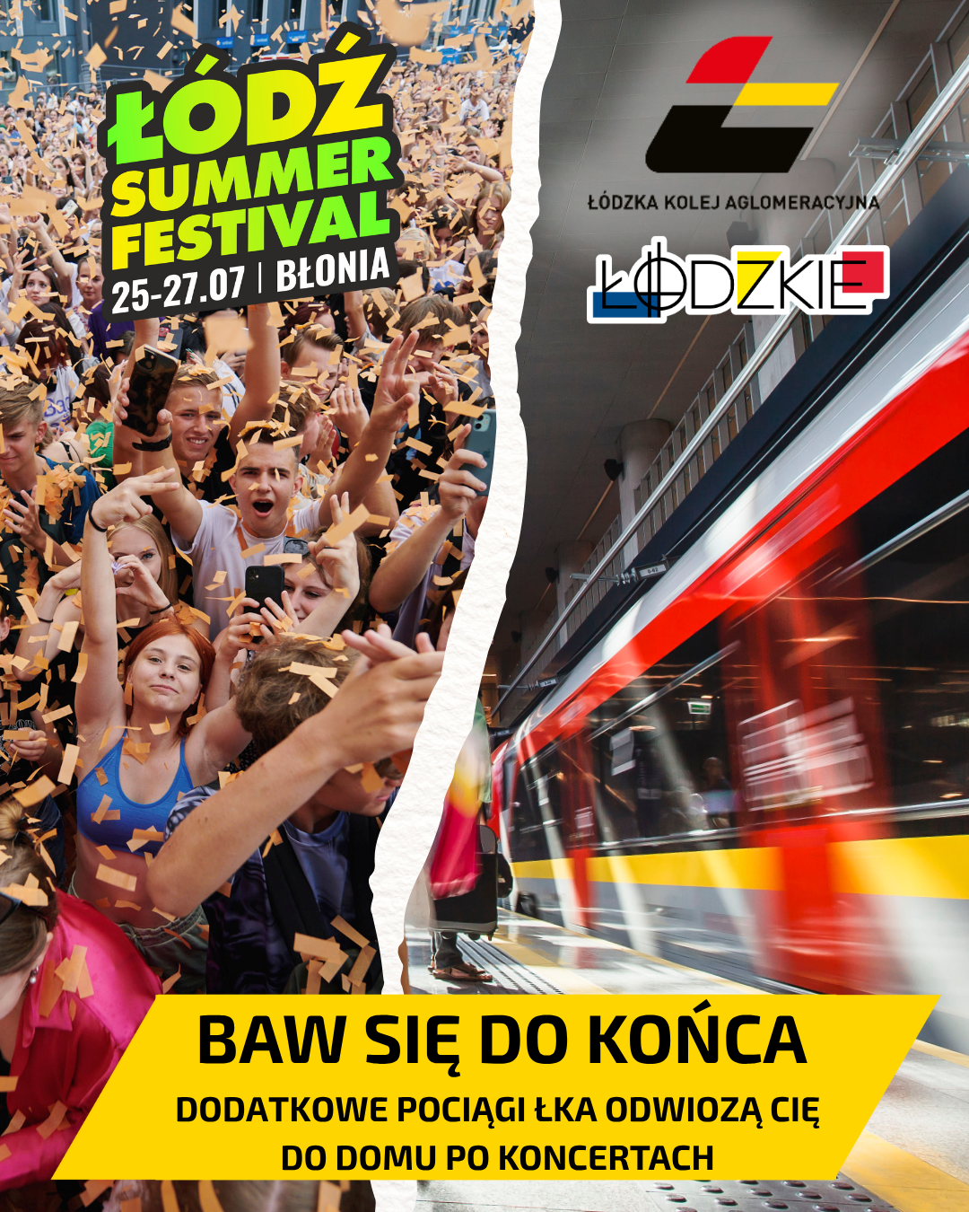Łódzka Kolej Aglomeracyjna gra z Łódź Summer Festival. Od 25 do 27 lipca uruchomi dodatkowe połączenia, dzięki którym mieszkańcy województwa będą mogli wygodnie dojechać i wrócić z koncertów. To gratka dla wszystkich osób, które nie chcą martwić się o dojazd na występy gwiazd na łódzkich Błoniach.