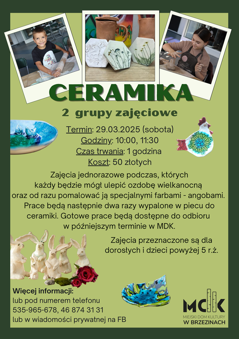 Miejski Dom Kultury w Brzezinach zaprasza na rodzinne warsztaty wielkanocne z ceramiki. Zajęcia odbędą się w najbliższą sobotę w dwóch turach: 10-11 lub 11:30-12:30. Każdy uczestnik będzie mógł wykonać swoją ozdobę świąteczną i pomalować ją specjalnymi farbami – angobami.