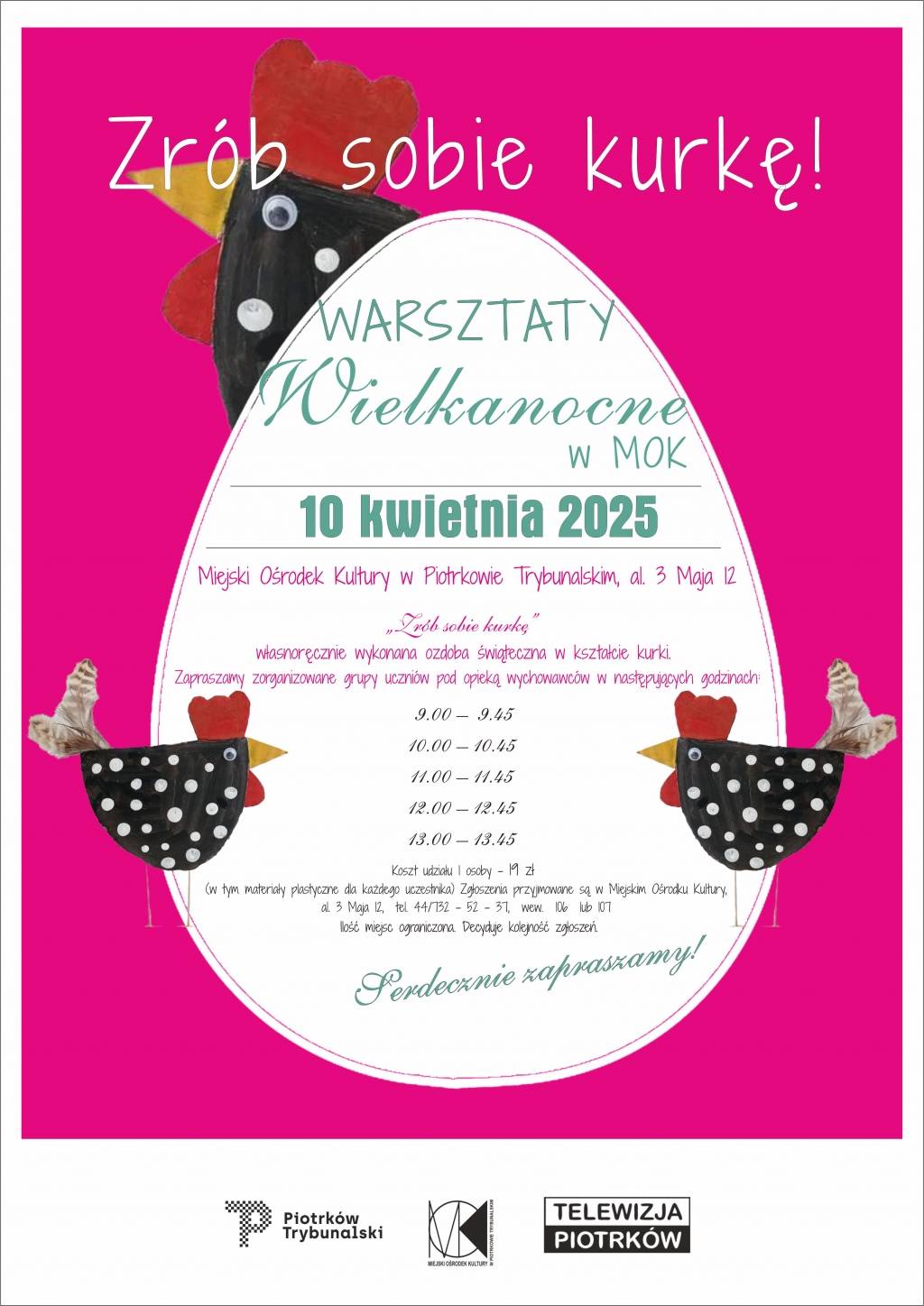 Zapisy telefonicznie lub za pośrednictwem poczty elektronicznej na adres: Ten adres pocztowy jest chroniony przed spamowaniem. Aby go zobaczyć, konieczne jest włączenie w przeglądarce obsługi JavaScript.. Koszt warsztatów wynosi 10 zł od osoby.