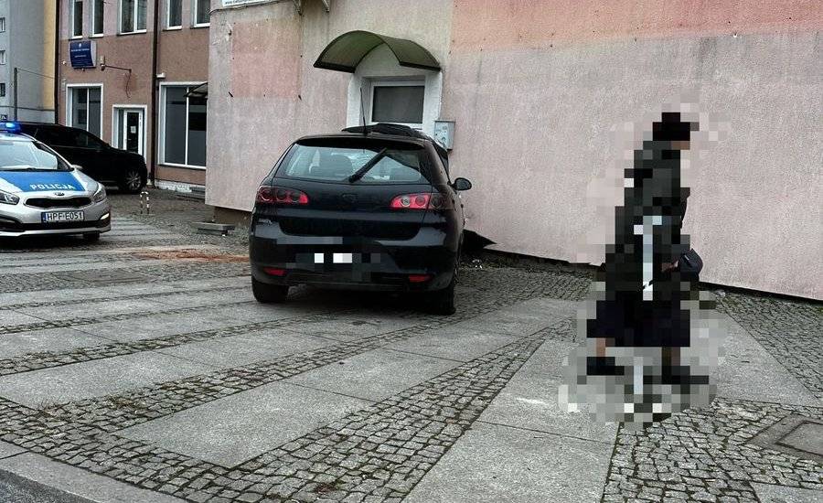 "Nie wyrobił" na rondzie, przejechał chodnik i uderzył w budynek! Był kompletnie pijany [Foto]