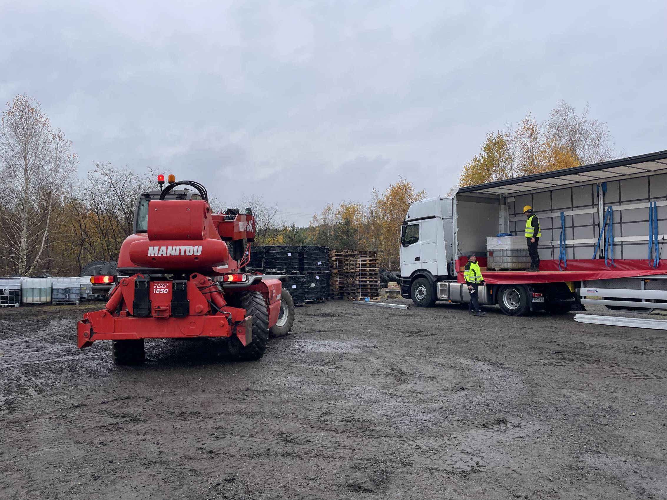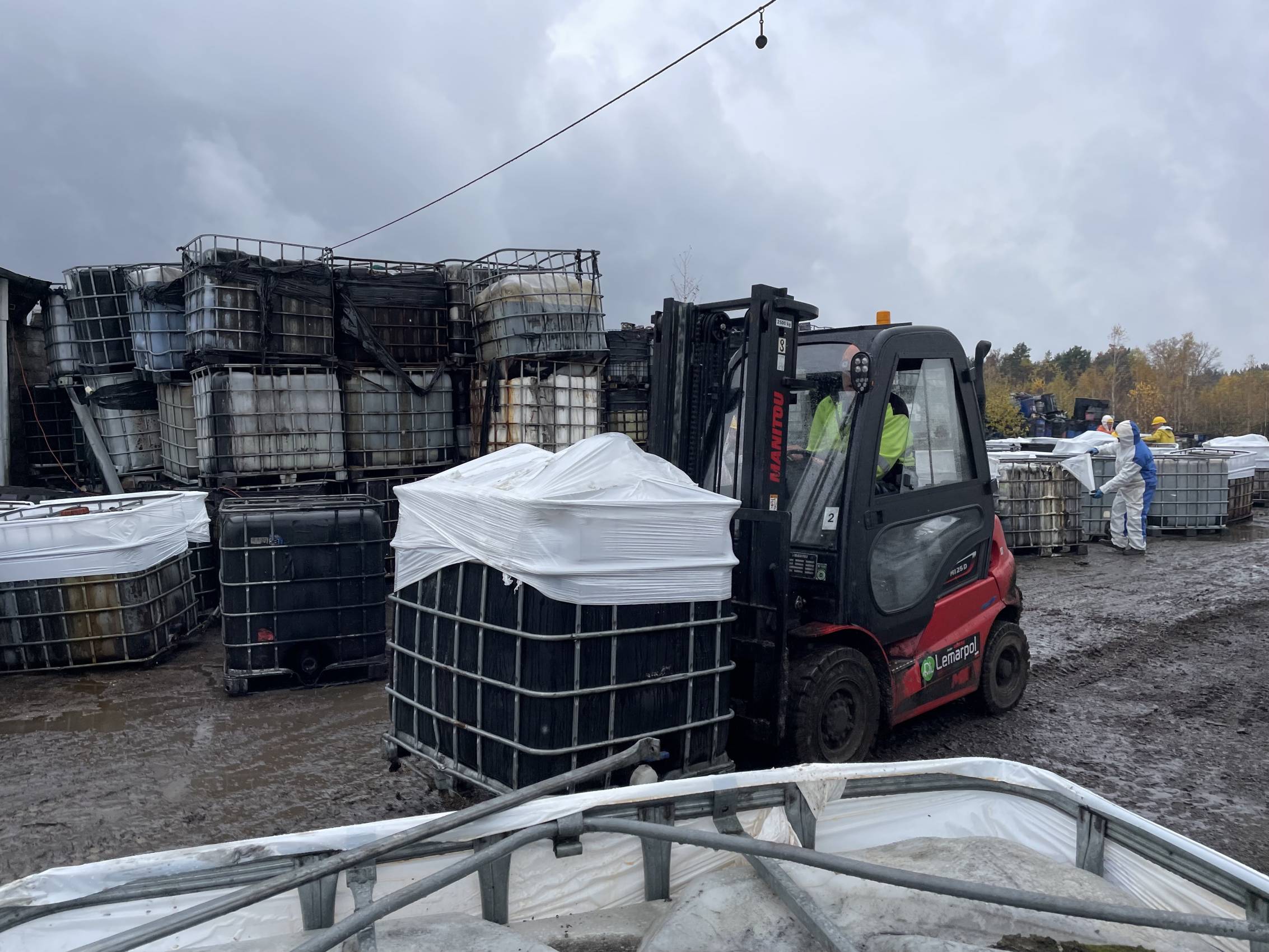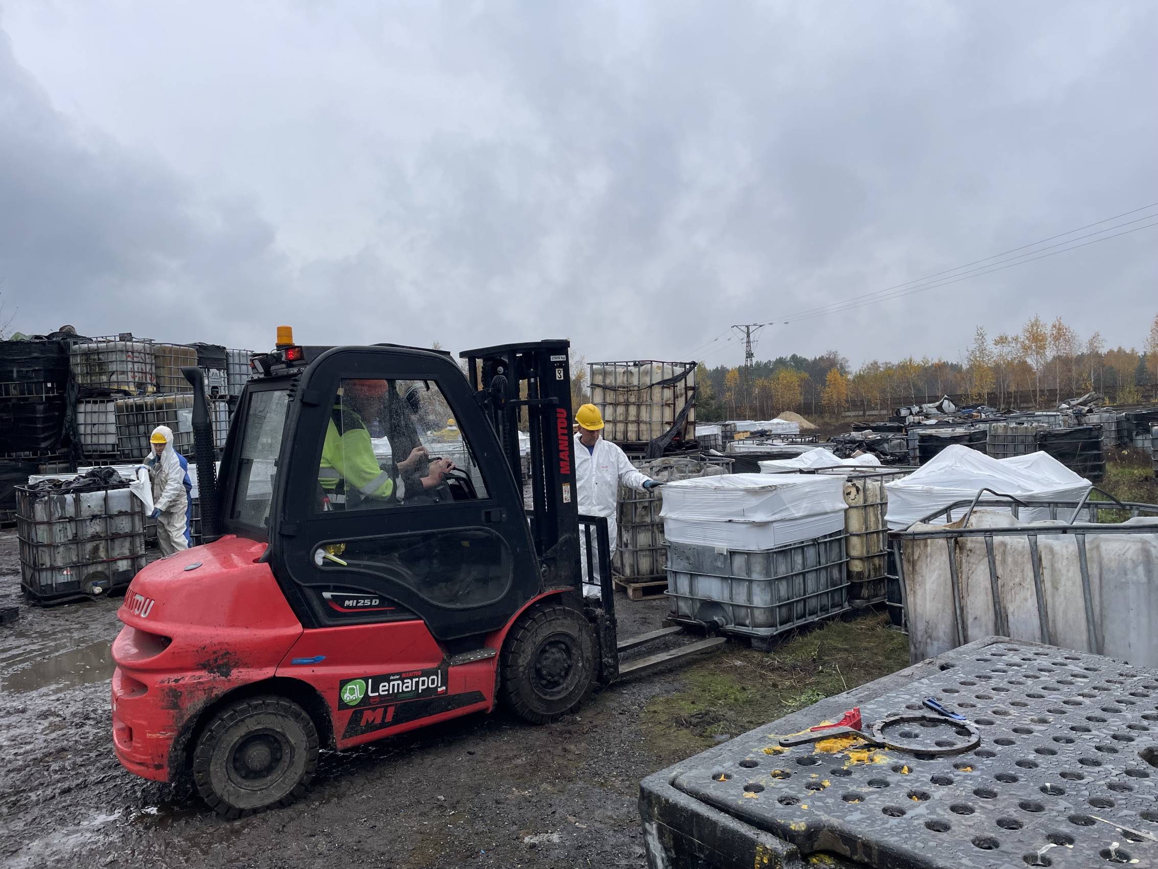 W Chabielicach rozpoczął się kolejny, kluczowy etap prac związanych z usuwaniem niebezpiecznych odpadów. W poniedziałek, 3 listopada, ze składowiska odjechało już kilka transportów z mauzerami zawierającymi substancje niebezpieczne – w momencie naszej obecności był to trzeci konwój. To początek intensywnej akcji, która ma doprowadzić do całkowitego oczyszczenia terenu.